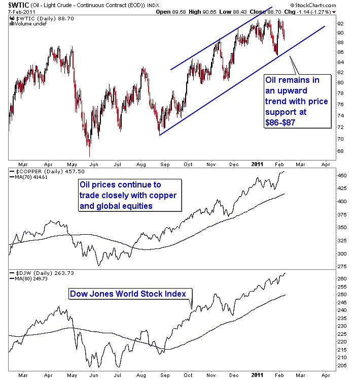 Bottom line: Oil prices are trading in near parallel paths with copper and global equity indexes. Economic growth is driving all three securities. As the outlook for world stock markets continues to improve, so does the expectation for higher copper and oil prices.