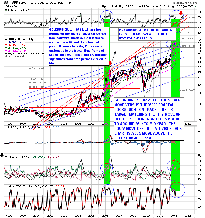 - The fib indicator is placed the same in both fractal periods - off of the last intermediate low with the 50% line off the top of the “recent high” (at black arrow) and the .618 fib off of the low that followed. This fib placement fit the next intermediate-term top (at red arrow) in the 2006 Silver Fractal. Today, an equivalent fractal top for Silver would come in around 56 into the May/ June 2011 time period at the RED ARROW. In the 2006 Silver Fractal, the next intermediate-term top came on a rise 65% above the last recent top. A similar target for May/ June would be to 52.8. This difference between fractal periods appears to be logical since we have reached a more aggressive portion of the parabolic rise on the chart, today, versus 2006.
