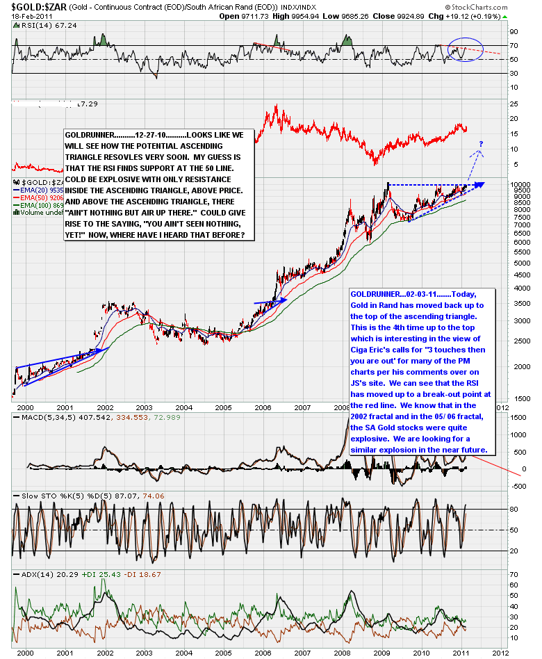 SA gold stocks could start to rise in a momentum run analogous to their runs in early 2002 and in 2005/ 2006. The RSI has already broken out while price sits at the top of the huge ascending triangle. It is "3 touches and out for the PM sector” (as per Ciga Eric), and if so, this is the 4th attempt at the top of the triangle. In the 2006 fractal period I showed with Silver, above, Gold in Rand rose sharply higher out of a triangle formation sending the SA Gold Stocks into an upward momentum run which, historically, have very large 3rd wave runs that tend to move in sync with the HUI Index.
