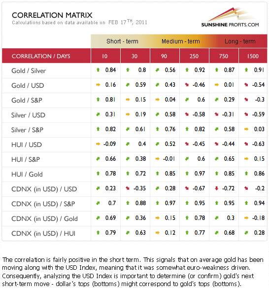 In the short term, the correlation between the dollar and gold indicates that the strength of the greenback is one of the primary drivers of increasing gold prices. Take note of the medium-high 0.59 coefficient found on the 30-day column. Silver is correlated with stocks as is indicated by the 0.61 coefficient.