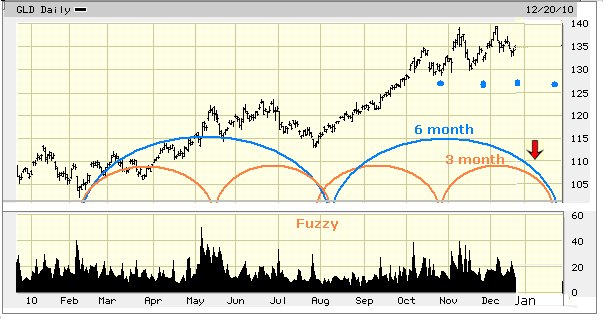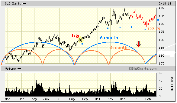 In the above chart, we see that the low was essentially 128 and the low came in on time. Since then we have gone up steadily for almost a full month. The blue dots mark 1 month cycles. Notice that we are due for a 1 month low now. When we go up this late in a cycle, it is called late translation and indicates that the larger cycles, such as the 3 month and the 6 month, are pushing up and adding lift. That is what we were expecting to occur. So far it seems to be confirmed.