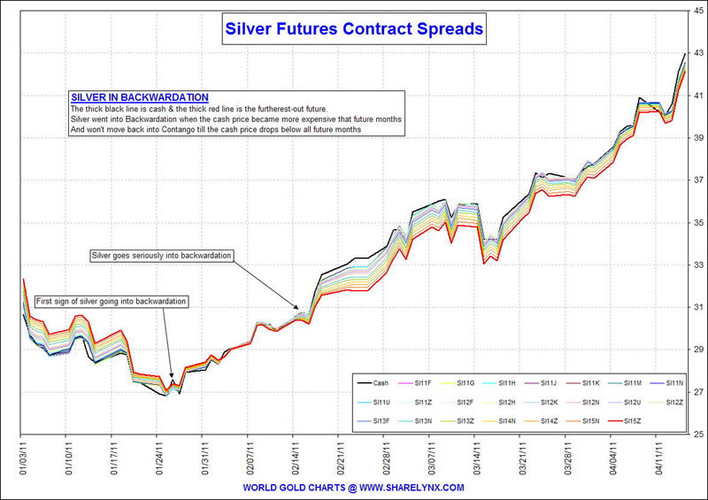 While silver is overbought in the short term, the fact that silver remains in backwardation even after the recent sharp move up suggests that higher prices may be imminent and the 1980 nominal high of $50/oz may be reached sooner that most expect.