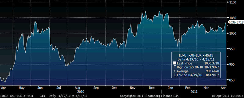 Euro gold has been in a range between €900/oz and €1,070/oz for nearly a year (since last May - see chart) and this period of consolidation looks set to come to an end as gold pushes higher. Once the technical resistance at the record high of €1,072/oz (12/28/10) is breached, gold will challenge €1,100/oz.