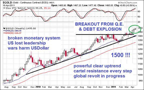As long as Quantitative Easing programs are in place and actively pursued, Gold & Silver prices will soar. The programs are urged by exploding budget deficits and absent USTBond demand. That translates to a ruined USDollar currency. Gold & Silver respond to the debasement and ruin. Efforts will become ridiculously stretched to save the USDollar, but will fail. QE will go global and secretive, assuring tremendous additional gains in the Gold & Silver price. No effort to liquidate the big USbanks will occur, thus assuring the process will continue until systemic breakdown then failure. The more extraordinary the measures to save the embattled insolvent fraudulent USDollar, the more the Gold & Silver price will soar. It is that simple. Gold & Silver will soar as long as central banks continue to put monetary inflation machinery to work. They are attempting to provide artificial but coordinated USTreasury Bond demand. In the process their efforts will continue to push the cost structure up further. In my view, since the Japan natural disaster hit with financial fallout, the Global QE is very much in effect, but not recognized as a global phenomenon. It pushes up Gold in uniform fashion worldwide.