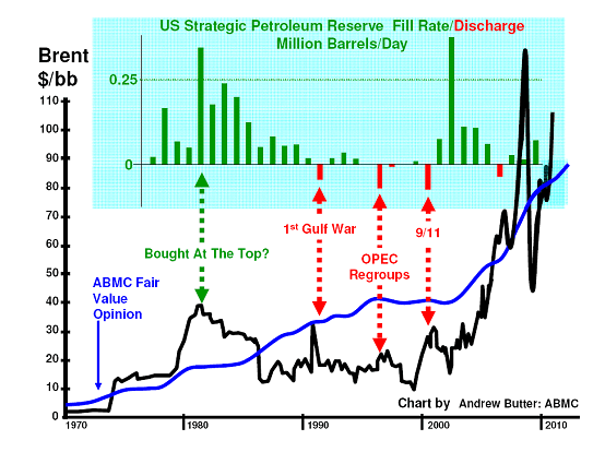 Well perhaps, looking at the chart there does seem to be some sort of a link between spikes in the price of oil (up and down), and the activities of the SPR, even though the historical fill/discharge rates are small compared to America’s imports of 9.7 million barrels a day.