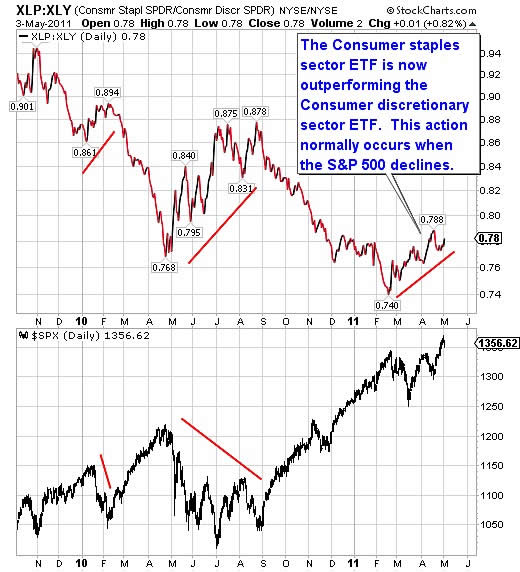 Over the past few years, this shift in buying pressure between these two consumer sectors has provided guidance to the short term movements of the broad-based S&P 500. As models are indicating that a low in the index is expected in June, the returning performance of the defensive staples sector over discretionaries adds some additional evidence to the anticipated pullback.