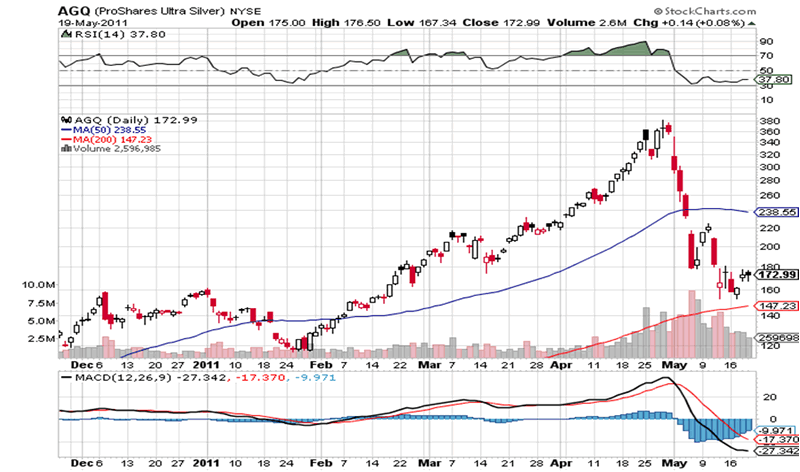 Our favourite commodity instrument, the Silver Ultra ETF: AGQ, was up nearly 100% since March. Its break below the previous low of 318.44 on the 2nd. May indicated it was a sell. Currently Silver is technically broken so it will be some time before we can be sure the worst is over. Thus I would recommend you save your profits and keep your powder dry until solid technical support is in evidence.