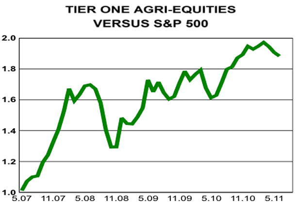We believe the Tier One Agri-Equity correction will also be less severe this time around. If it is half to two thirds of what occurred in 2008, then the current situation is about 50-75% of what might be expected. Combining that estimate with the normal seasonal doldrums during the Summer suggests a timely bottom for Tier One Agri-Equities might be August-September.