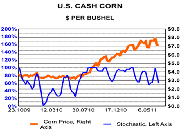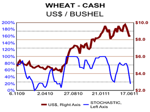 Already U.S. cash wheat prices, as shown in the above chart, have started moving down, having fallen about 14% from the high. With the combines headed north in Kansas and China, the Northern Hemisphere wheat harvest is progressing well. Thus far, despite overall U.S. wheat production being less that "normal", the Kansas crop is better than expectations. Weights are good and protein levels perhaps above average. One of the oddities often of food production is that a better crop if often produced by less water rather than more. We expect US$8 price, formerly a support level, to now become a resistance level.