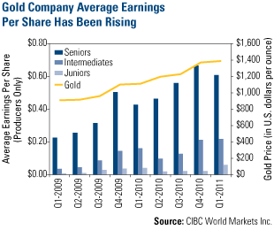 The high long-term levels in these ratios indicates that profit margins should be strong as is. Below is a chart from Frank Holmes and CIBC that shows earnings have been steadily increasing across the entire sector. In recent quarters the intermediates and juniors have shown the strongest earnings growth.