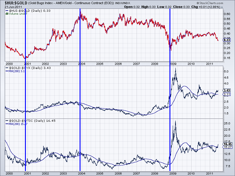 We use a 200-day moving average to smooth out the volatility. In the summer of 2008, the 200-day MA of the Gold/Oil ratio was about 8. Its presently at 15 which aside from early 2009, is at a 10-year high. The Gold/Industrial Metals ratio in the summer of 2008 was at 2.0. It's now at 3.11. In 2007-2008, the ratios were near four-year lows and that was reflected in the weak relative performance of gold stocks. Note that the ratios began rising in summer 2008 and then a few months later, gold stocks rocketed higher in nominal terms and relative to Gold. These ratios have been rising for several months and if it continues, we should expect gold stocks to strengthen against Gold.