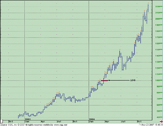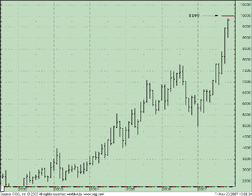 For example, take a look at the chart of Chicago Mercantile Exchange Holdings (CME) from April of 2004. That was the first time the stock crossed 100.