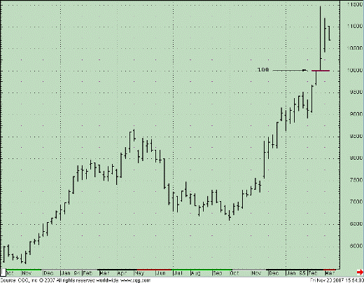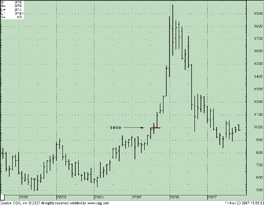 When sugar first crossed 100 (1,000 on the tape, or 10 cents per pound) in October 2005, it didn't stop either. It quickly ran above 1,100, then above 1,200 and then above every XX00 until it reached at its 1,973 peak in February 2006.