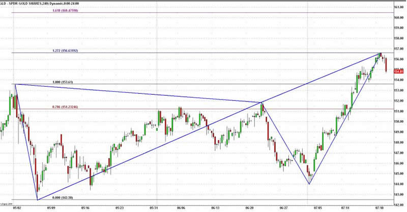I would make sure to point out that if the pattern fails the move higher will be swift and harsh. The pattern would still be intact if prices were to get to $160/share on $GLD. Fibonacci butterfly patterns show up all the time in price action. Just like any other type of analysis, they are not fool proof nor do they always work out. However, the presence of such a pattern must be noted. If the pattern fails gold will be off to the races, but if the pattern plays out a selloff is right around the corner.