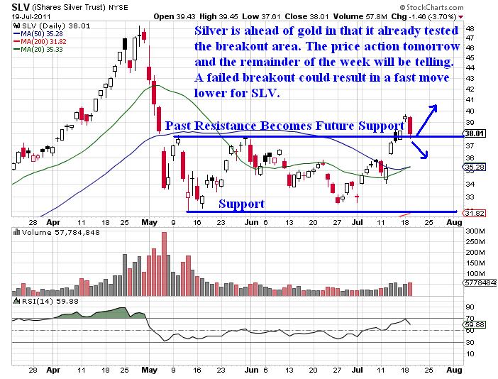 Switching gears to silver, a back test of the breakout level is likely. Similar to gold, how price handles the breakout level will be telling. If silver prices push through support it is likely that the white metal will sell off sharply and price would carve out a failed breakout which could add momentum and volume to the selloff. Currently as I write this silver is testing the breakout level. The next few trading sessions will be critical in determining the price action of the white metal in the short run. The daily chart of $SLV is shown below: