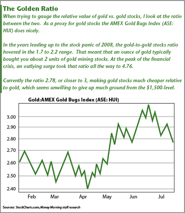In my years as a natural-resources analyst, I've come across several other value measures, which I've also put to good use. One of my other favorites is a useful ratio that can be calculated by comparing the relative value of gold versus gold stocks.