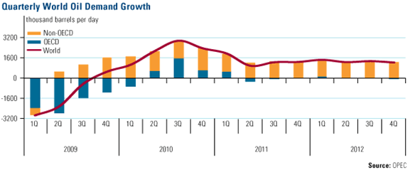 While demand growth in OECD countries is underwhelming, consumption rates have recovered from recession lows at a much faster rate than many expected. You can see that OECD demand contributed heavily to the recovery in global oil demand from early 2009 to late 2010. In fact, the developed world contributes little to global oil demand growth but still consumes more than half of the world’s total demand.