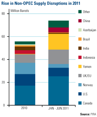 Oil production was rocked by several unexpected outages during the first half of 2011. The revolution in Libya, political divisions in Iraq, terrorist pipeline attacks in Nigeria, accelerating drug violence in Mexico and instability in Yemen have all negatively impacted oil production. PIRA puts the total loss of non-OPEC production at 74 million barrels. This is more than the entire amount of production losses in 2010.