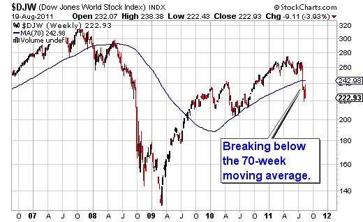 Bottom line: The bear market is anticipated to continue into year-end. The first downside target for the Dow Jones World Stock Index is 205.