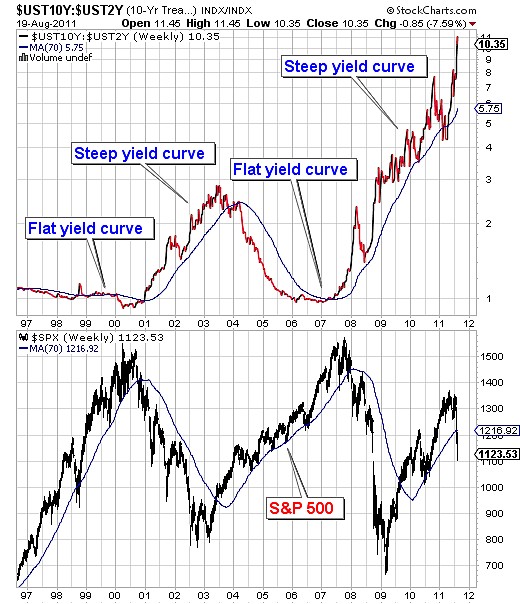 Market tops are normally associated with flat yield curves. Short term rates gradually climb as an economy expands. 1999 and 2006 were two examples of recent flat yields before significant equity declines developed (Chart 2). The present yield curve is very steep.