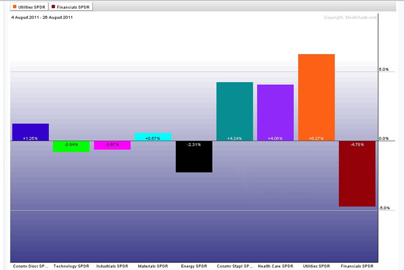 One of the first signals of the bottom in the bear market, will come from the leading industry groups. Financials and consumer discretionaries will outperform the defensive sectors indicating growth is more important then safety.