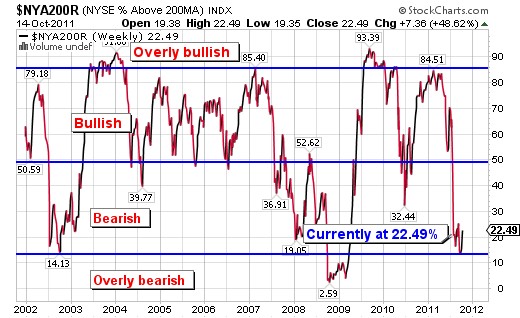 Currently there is only 22.49% of the stocks on the NYSE trading above their 200-day moving average. In comparison, the deep mid-2010 correction saw the percentage dropped to 32.44% only to quickly rebound back to a bullish 50%-60%.