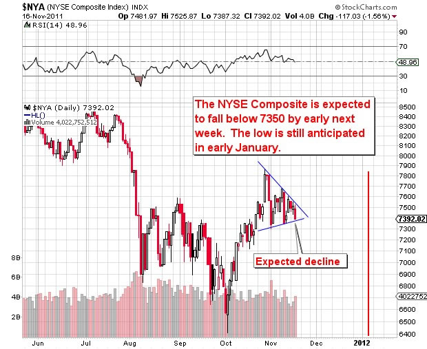 After several weeks of stalling, today's movement on the broad-based NYSE Composite suggests that the index is expected to decline (Chart 1) over the next few days. Price support has been at 7350-7400. That level should be broken by early next week.