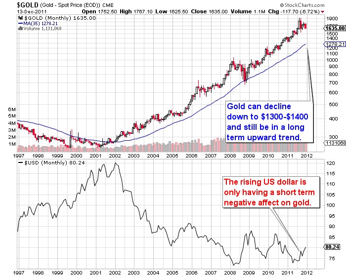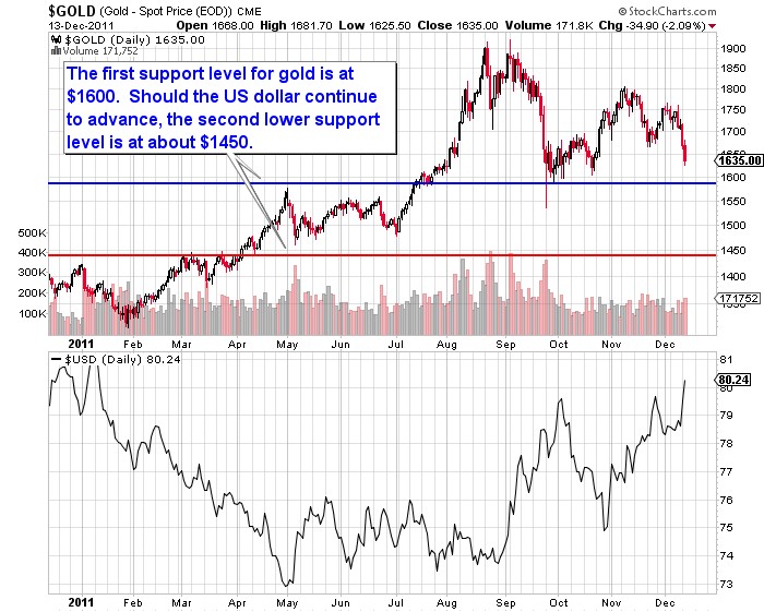 The length of the this current bear is unknown. Should it persist into 2012, then the dollar could advance back to $0.88 and gold will likely decline down to the moving average again (Chart 1). The yellow metal can decline down to $1300-$1400 and still be in a decade long advance.