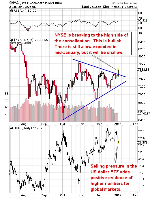 Worries about global markets, and particularly with Europe, appear to be forgotten as the NYSE Composite drives above resistance levels in the first trading day of 2012.