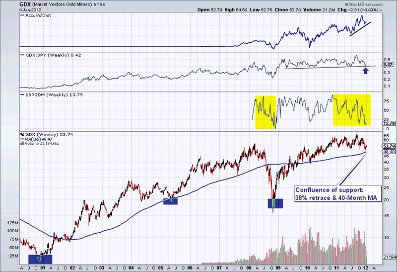 We also want to note how the market has made major bottoms in 2005, 2008 and at the very end of 2011. Including the low in 2000, that is four major lows for this bull market in its first 11 years. This is similar to a few previous bull markets which include the Nasdaq (80s and 90s) and the gold stocks (60s and 70s).