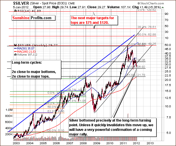 In the very long term chart for silver (if you’re reading this essay at www.sunshineprofits.com, you may click on the above chart to enlarge it), we see that silver has bottomed once again. If the nearest resistance level is broken, a significant rally is possible. RSI levels support the significant rally theory beginning now.