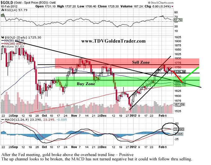 TDV Golden Trader writes: At the beginning of last week, we mentioned that gold was still in the up channel, but something to watch for is gold diverging out of the channel and that this could signal the start of a correction. Thursday and Friday’s price action last week is concerning for short term trading going into this coming week because gold is no longer in the strong up channel that has been in place for the last six weeks. We mentioned that gold was bumping up against resistance at $1750 and that a reversal could be in the making. Gold most likely will continue its correction and sideways pattern during the early part of this coming week.
