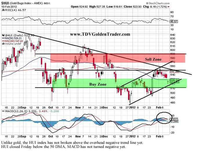 Depending on which way gold trades this coming week, the HUI will most likely follow. If gold sells off early Monday towards $1720 (maybe $1700), the HUI index will most like trend down towards 520 (maybe 510) and test the bottom channel line. That is when we will evaluate adding to new positions or our exiting our trading positions, depending on how gold behaves on Tuesday and Wednesday. At the moment, the HUI is at the lower end of the trading range but the mining stocks in general are neither a buy nor a sell.