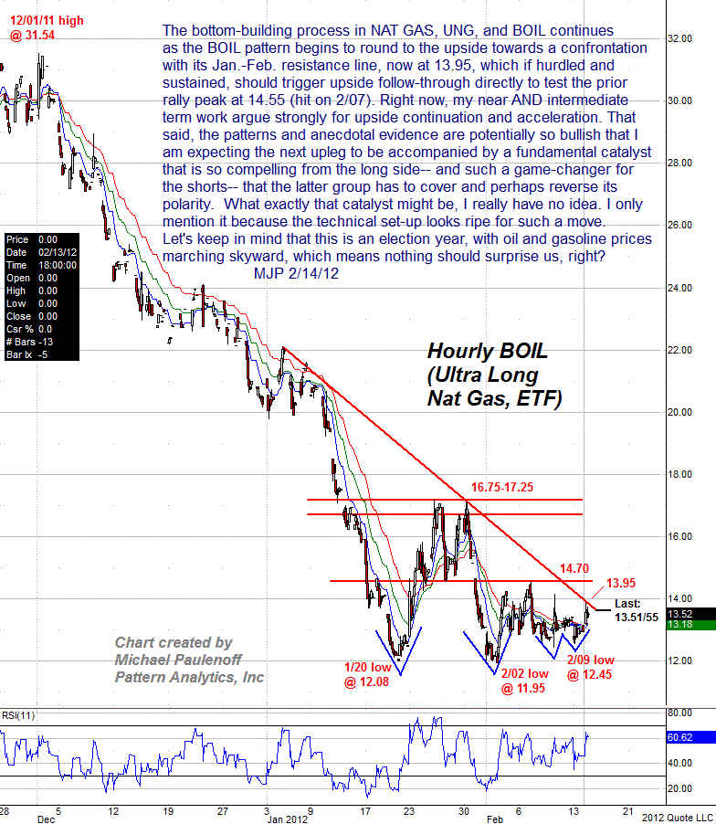 The BOIL pattern begins to round to the upside towards a confrontation with its Jan-Feb resistance line, now at 13.95, which if hurdled and sustained should trigger upside follow-through directly to test the prior rally peak at 14.55 (hit on Feb 7).