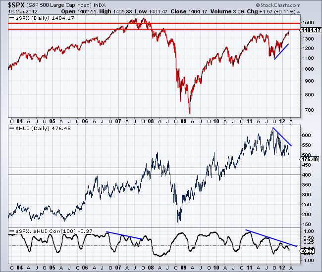 Below we plot the S&P 500 and the HUI Gold Bugs Index. At the bottom we show the 100-day correlation between the two markets. Note that the correlation has been trending down since the end of 2010. The broad stock market (S&P 500) appears to be headed for a test of major resistance at 1500 while the large cap gold stocks just closed at a 52-week low.