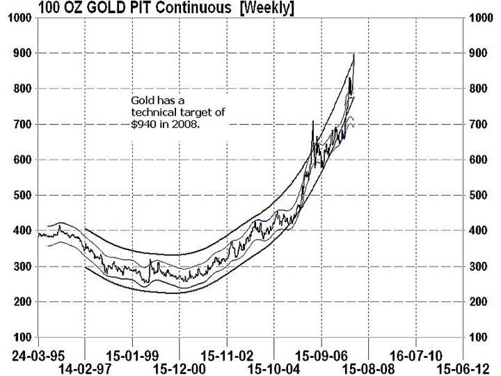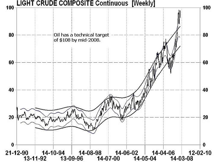 The rise in gold (Chart 2) from below $300 to over $900 in six years can be greatly contributed to the on-going bear market in the U.S. currency. The fundamentally distressed dollar continues to break support levels month-after-month which drives up the yellow metal to price levels not seen in 30 years. Technical models currently suggest the run in gold is not over. This precious metal has a short-term target of $940 by the second quarter of 2008 and considerably higher by 2009. Conversely, the rise in gold indicates the U.S. dollar is expected to fall further below present levels. The technical target for the Greenback is $0.724.