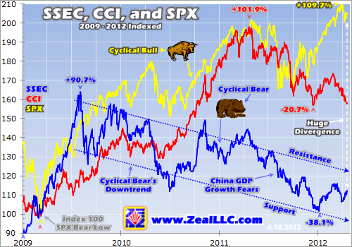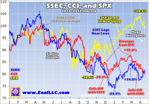 But unfortunately in early March, both the CCI and SSEC started their vexing divergences away from the SPX’s strong upleg. One immediate catalyst was China’s Premier Wen Jiabao cutting its 2012 economic-growth target to an 8-year low of “just” 7.5%. Personally I didn’t take this too seriously. 7.5% growth for the world’s second-largest economy remains amazing in an absolute sense, what an achievement!
