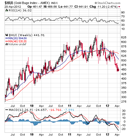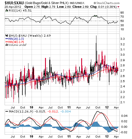 The investment world is currently full of paradoxes. For example, whilst the Gold Bugs Index (the $HUI which is made up of more speculative counters in precious metals) has been deteriorating strongly – see chart 1, courtesy stockcharts.com – the ratio of the $HUI/$XAU shows that the $HUI has been rising since early 2011.