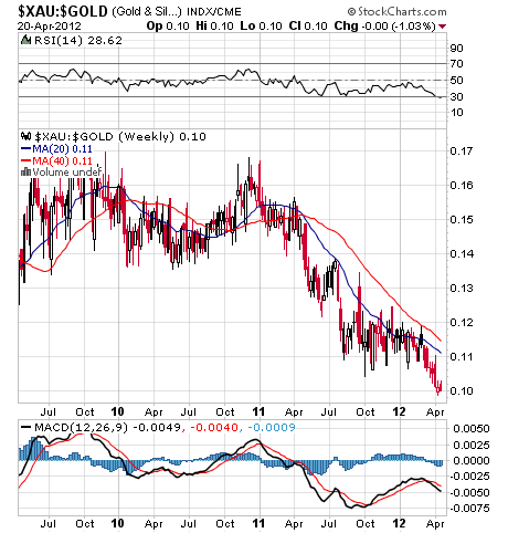 Further, if that were to happen – ie the gold price were to rise strongly – then the price of the shares (XAU and HUI) to gold will have to “scream” up – given that the ratios are oversold.