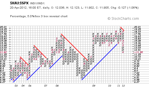 But therein lies another paradox. Chart 5 below shows the ratio of the $XAU divided by the $SPX: (Note that the scale of this chart is very insensitive. It has been adjusted to show three box reversals in moves of 5% at a time.)