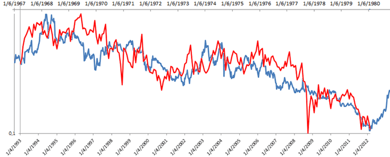 On the other hand, here’s another interesting chart, showing the BGMI-to-Gold (BGMI = Barron’s Gold Mining Index) from 1967 to 1980 (blue line) and the HUI-to-Gold ratio from 1993 until today. If this pattern continues, it could mean that the underperformance of the Gold Stocks is about to end.