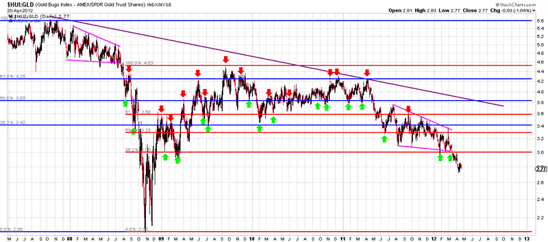 Despite general stock markets approaching pre-crisis highs and Gold holding up quite well so far, the HUI index has dropped quite substantially. The combination of weak performance of HUI stocks and the relatively “strong” action of Gold, caused the HUI index to underperform Gold dramatically.