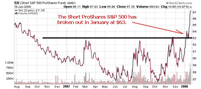 Chart 2 of the Short Dow 30 ProShares ETF (symbol is DOG) has a similar picture. The short Dow 30 ETF has had growing volume over the past 12 months and has made a technical breakout at $61.50. After over five years of expansion, the Dow Jones Industrial Average has reached a peak and is beginning a decent.