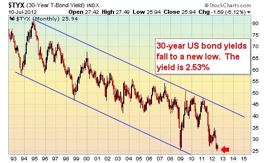 US bond yields have been in a secular decline for over 20 years. The recent movement out of risk and growth assets and into the safety of fixed income has pushed the yield on 30-year US Treasuries down to a new low- 2.53%.