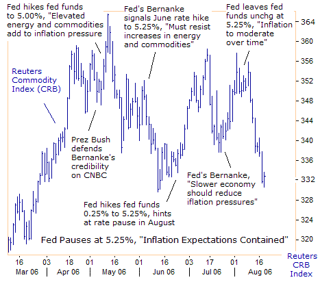 If commodity prices are confined into a sideways trading range for an extended period of time, the year-over-year comparison of inflation readings would start to look good. The US economy slowed to a 2.5% annual growth rate in Q2, after sizzling at 5.6% in the previous quarter. Also, Labor Dept apparatchniks have reported US producer prices rose a scant 0.1% in July. Bernanke has authorized three quarter-point rate hikes to 5.25% under his tenure as Fed chief, attempting to transform his reputation from a super-dove into a wise old owl on monetary policy.