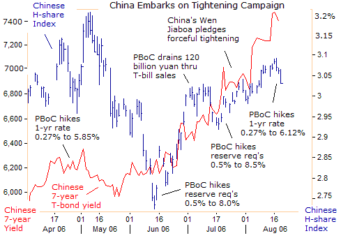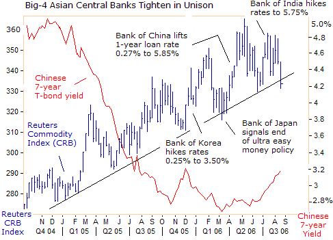 To avoid a hard landing in the juggernaut Chinese economy, the big-4 Asian central banks in China, India, Japan, and Korea are spreading the risk around, by tightening their monetary policies in synchronization. The Bank of Korea took the first step by hiking rates 0.25% to 3.50% in November 2005, and went to 4.50% on August 11 th . The Bank of Japan began to dismantle its five-year ultra-easy money policy in March, the Bank of China hiked its 1-year loan rate to 5.85% on April 24 th , and the Bank of India hiked rates in June and August to 6.00 percent.