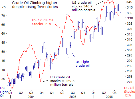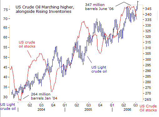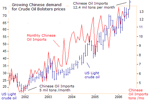 In the United States, the world's largest oil consumer of 21 million bpd, the price of crude oil briefly rose to an all-time high of $78.40 per barrel in electronic trading on July 14 th . The uptrend in crude oil has confounded market bears, because prices are climbing alongside a 25% increase in US commercial oil stocks from two years, to an eight year high of 347 million barrels in June. In the past two weeks however, US crude oil stocks fell 3% or 11 million barrels to 336 million barrels. US oil companies are hoarding oil supplies, in case Iran withholds crude-oil exports or targets oil tankers in the Persian Gulf. Iraq is falling into a civil war and its daily oil output of 2.4 million bpd is unstable. And now China has just completed oil storage tanks in Zhejiang, Shandong and Liaoning, with capacity to hold up to 88 million barrels, and is planning a third phase of yet another 200 million barrels of storage, to be completed by 2008.