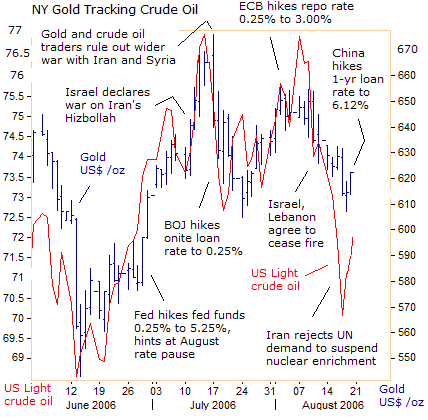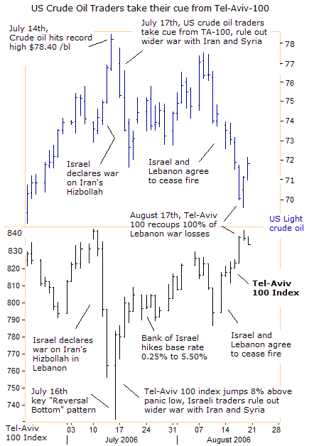 Because Tel-Aviv stood in the cross-fire of the Israeli–Hizbollah skirmish, US traders took their cue for the Tel-Aviv-100 index's “reversal bottom” pattern on July 16 th , which ruled out a wider war with Iran and Syria in the first round, and then dumped West Texas crude oil the next day, from a record high of $78.40 per barrel on July 14 th . The TA-100's recovery to the 840-level on August 17 th , where it stood on the eve of the Lebanon war, briefly knocked crude oil below $70 per barrel. But bullish Tel-Aviv traders might be living in a fool's paradise. On August 20 th , Israel MK Binyamin Ben-Eliezer warned that "the next round of fighting against Hizbollah could be held within several months. You have to read between the lines.