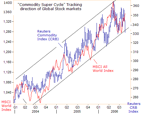 The explosive growth of the global money supply in developed and emerging economies after 9/11, might explain the buoyancy of global stock markets at a time when sharply higher oil prices, would otherwise have been as a negative influence. For the past few years, the Reuter's CRB index has “followed the money” and tracked Morgan Stanley's All-World Index, for clues about the health of the global economy, consumer confidence, and in turn, the demand for commodities.