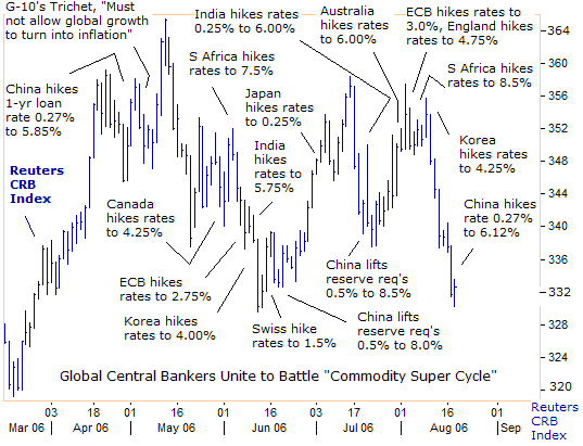 Most notably, the Bank of Japan (BOJ), the European Central Bank (ECB), the Bank of England (BOE), the Bank of Australia (RBA) the People's Bank of China (PBoC), the Bank of India (RBI), the Swiss National Bank (SNB), the Reserve Bank of South Africa (RBSA), and the Bank of Korea (BoK), have all stepped up to the plate to raise short-term interest rates over the past three months. The concerted round of central bank rate hikes are starting to wear down the “Commodity Super Cycle,” and more rate increases look likely in Australia, China, the Euro zone, England, Japan, South Africa, and Switzerland by year's end. It's probably fair to say, that the legion of 8,800 hedge funds, which control $1.2 trillion, are losing their speculative appetite for commodities, as global interest rates rise, and were behind the August sell-off in the Reuters CRB index.